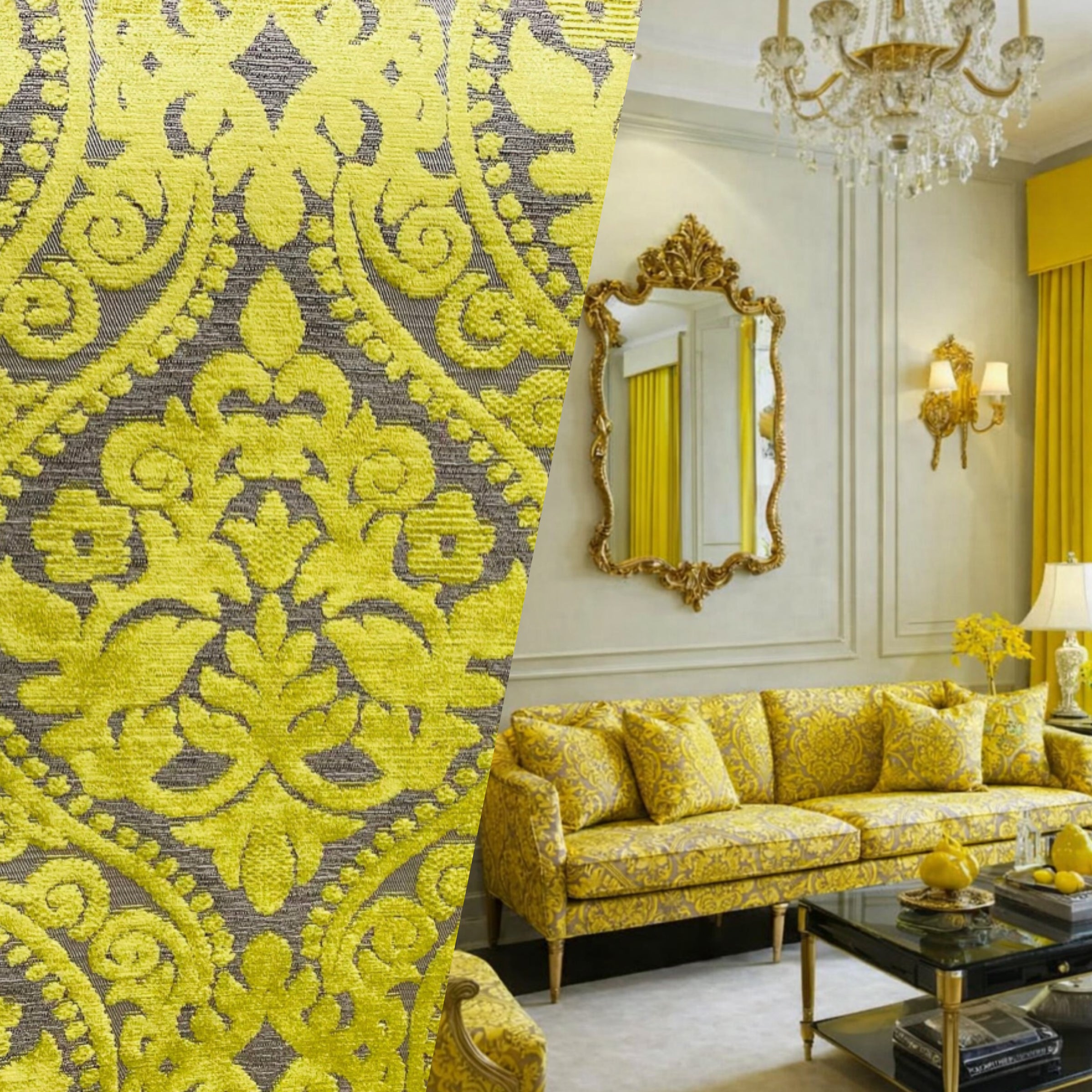 Another thick beautiful burnout novelty velvet! A beautiful durable upholstery weight designer burnout velvet woven fabric. Inspired by Versailles, the bright yellow hue creates a damask motif across the fabric. The burnout velvet has a very rich thick pile, almost chenille type texture. Can be used for upholstery, interior decorating, or coat garments. Sold by the yard. 56” wide.