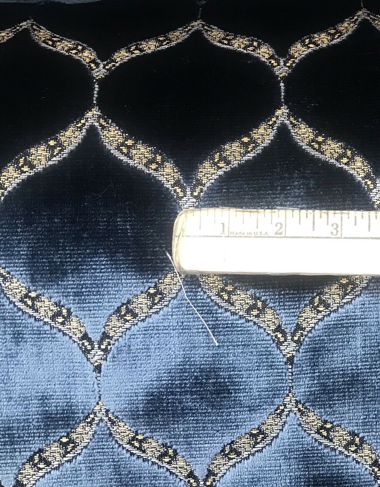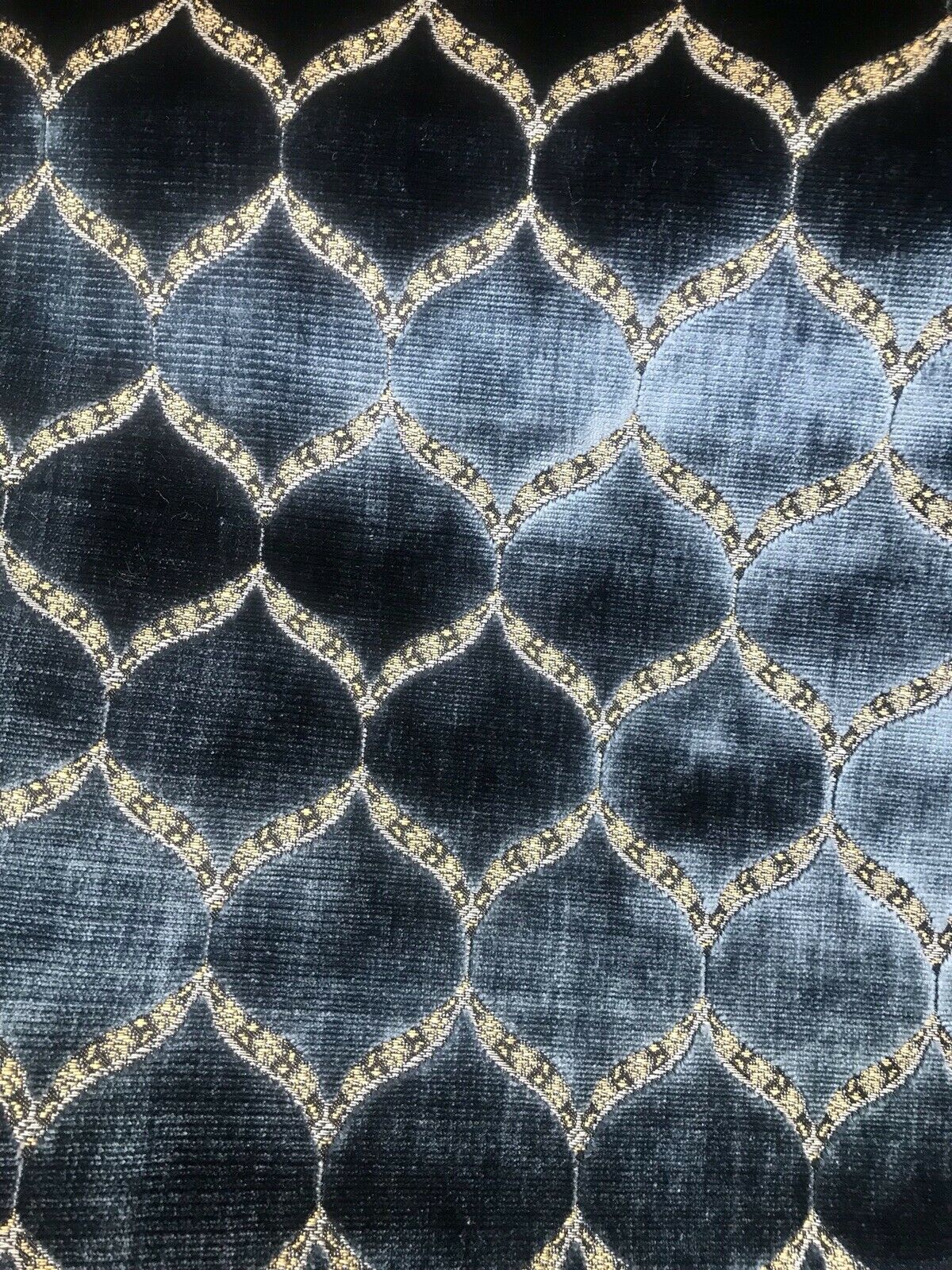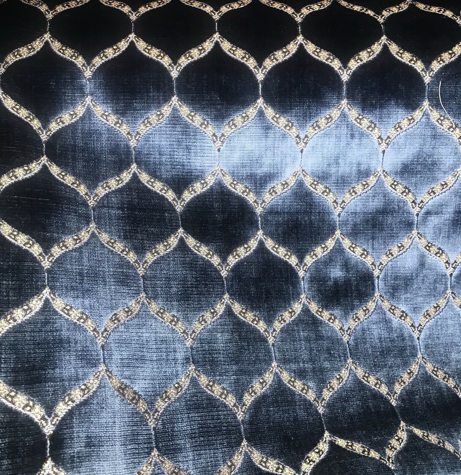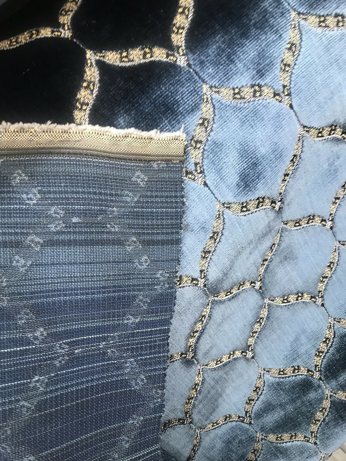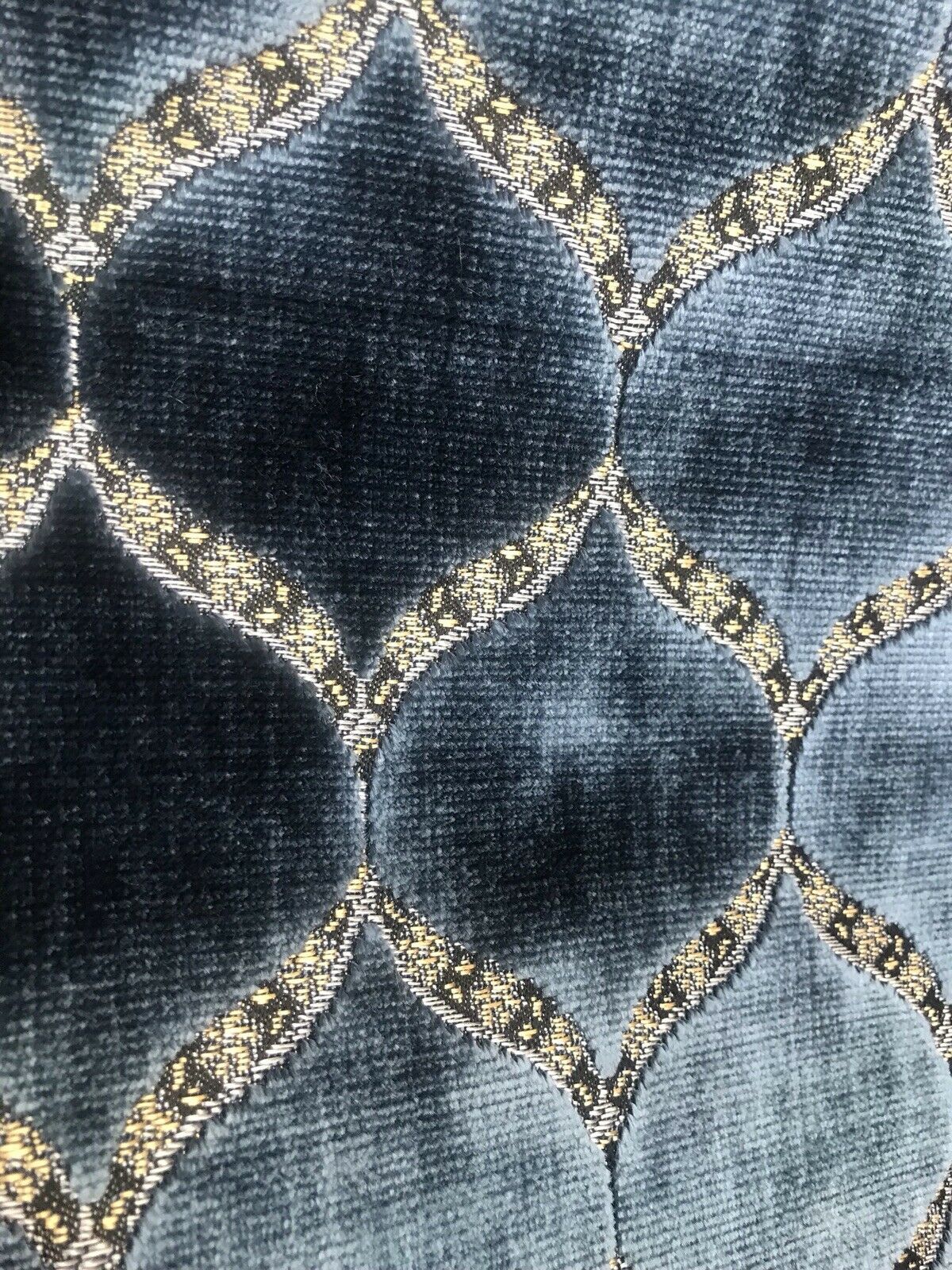 A brand new INCREDIBLE thick burnout upholstery velvet from Italy! The quality of this fabric is exquisite, photos do not do it justice! A beautiful heavy upholstery weight designer burnout velvet woven fabric in the most incredible shade of jewel blue with gold geometric motif. The burnout velvet has a very rich thick pile. The last photo features a matching fabric that we also have available. We have limited quantities of this fabric (about 55 yards left in total). Can be used for upholstery, interior decorating, or coat garments. This fabric is sold by the continuous yard.