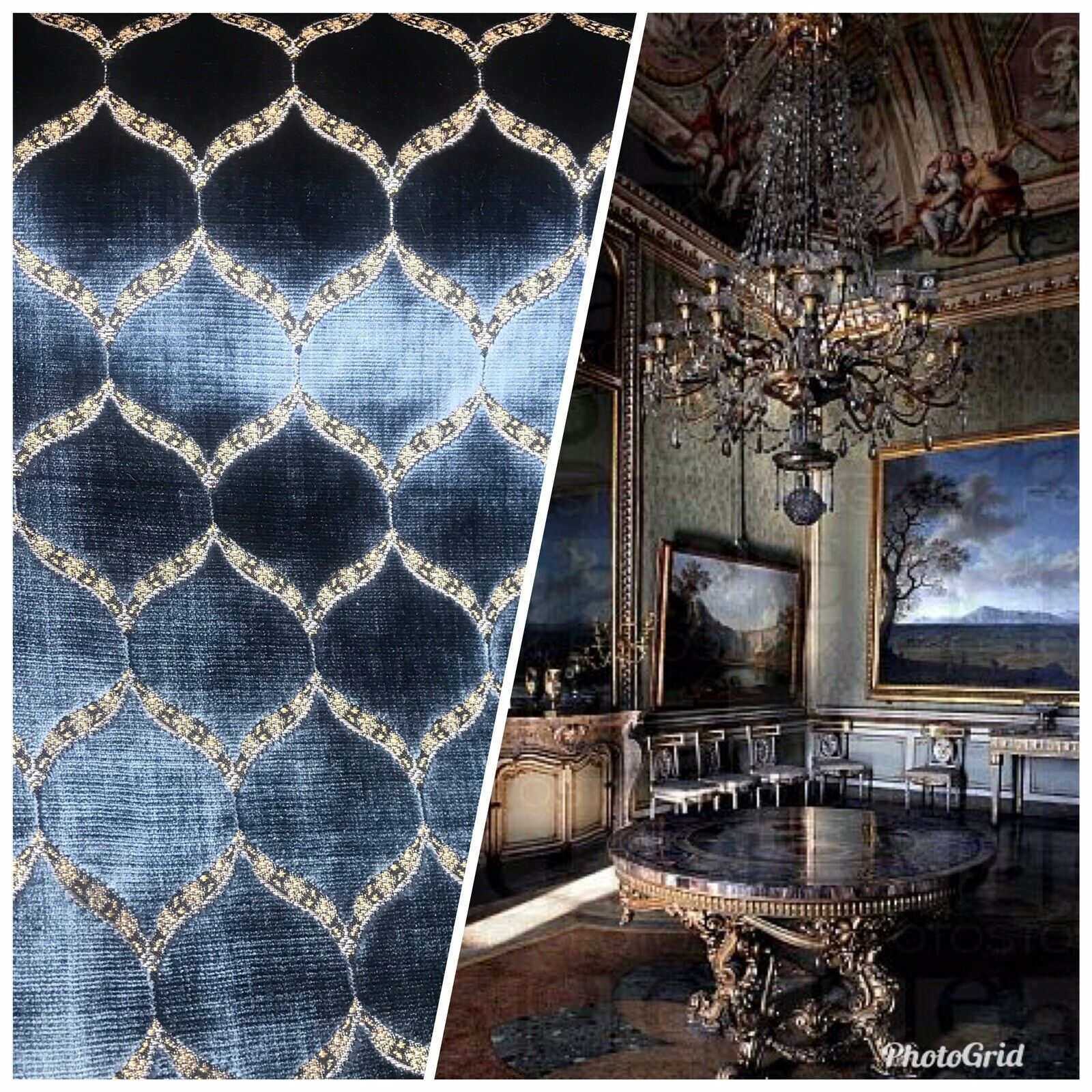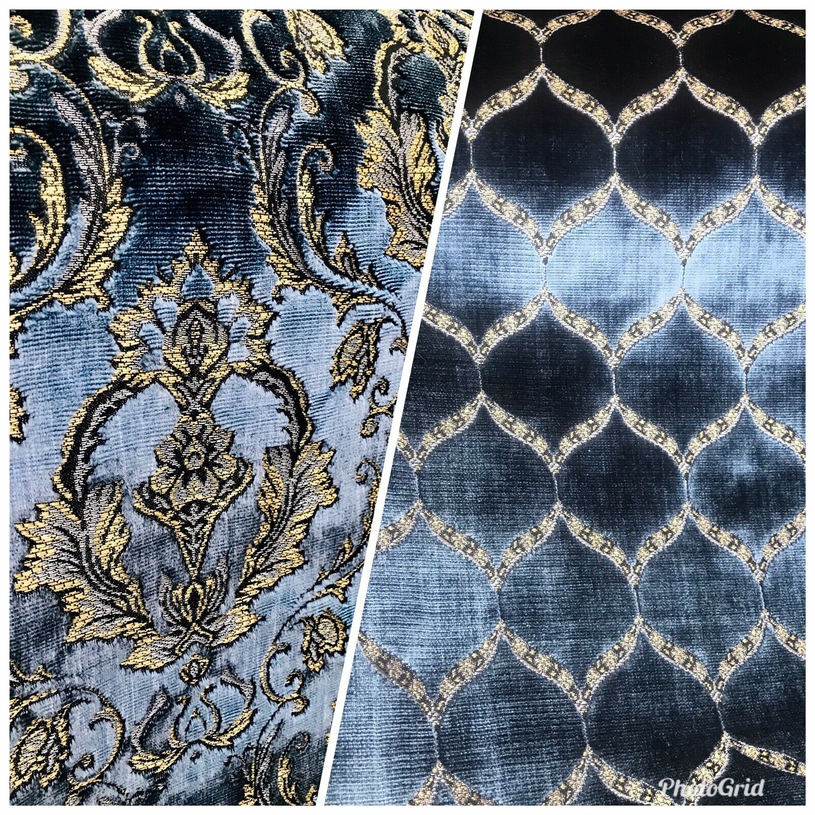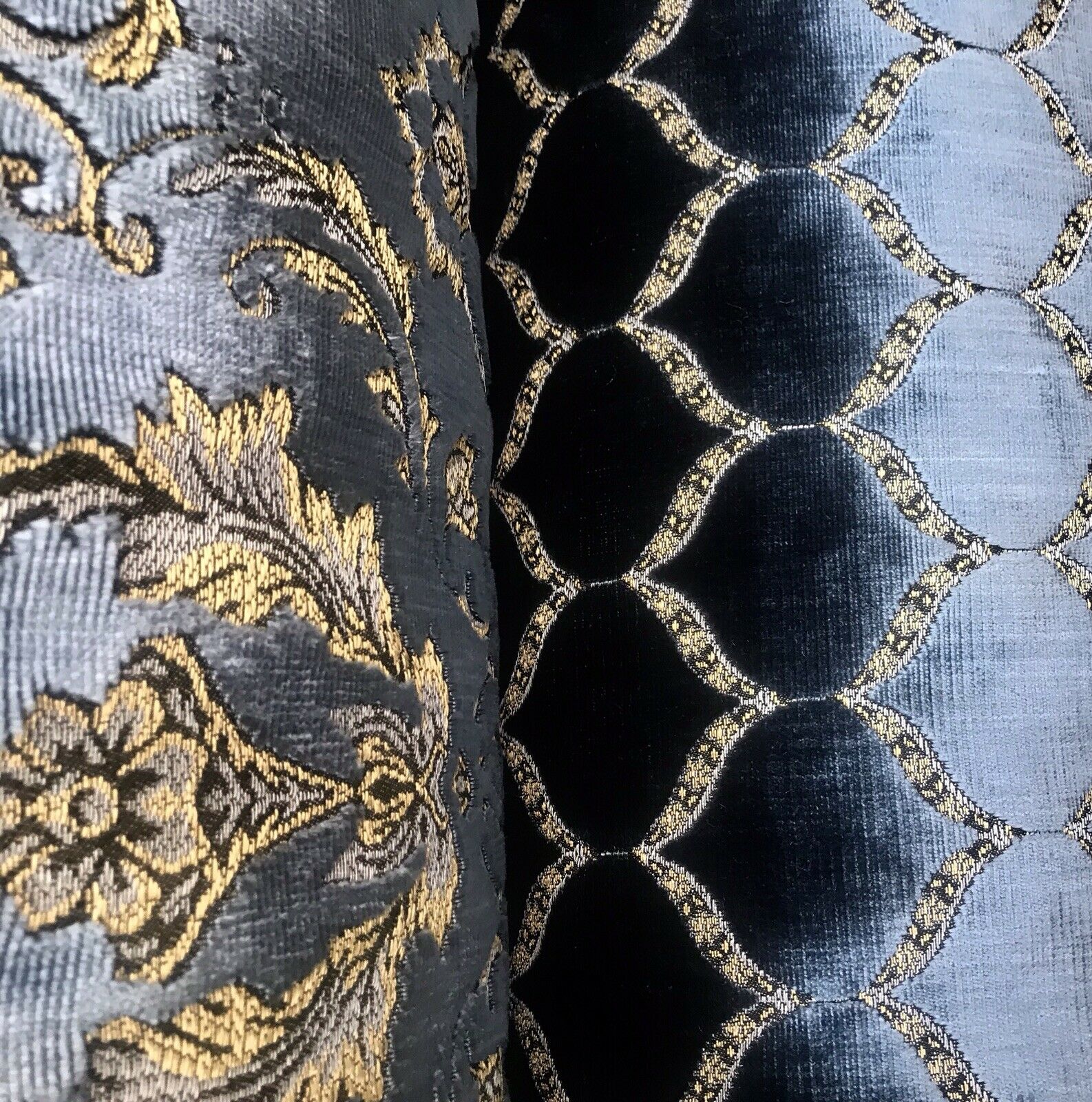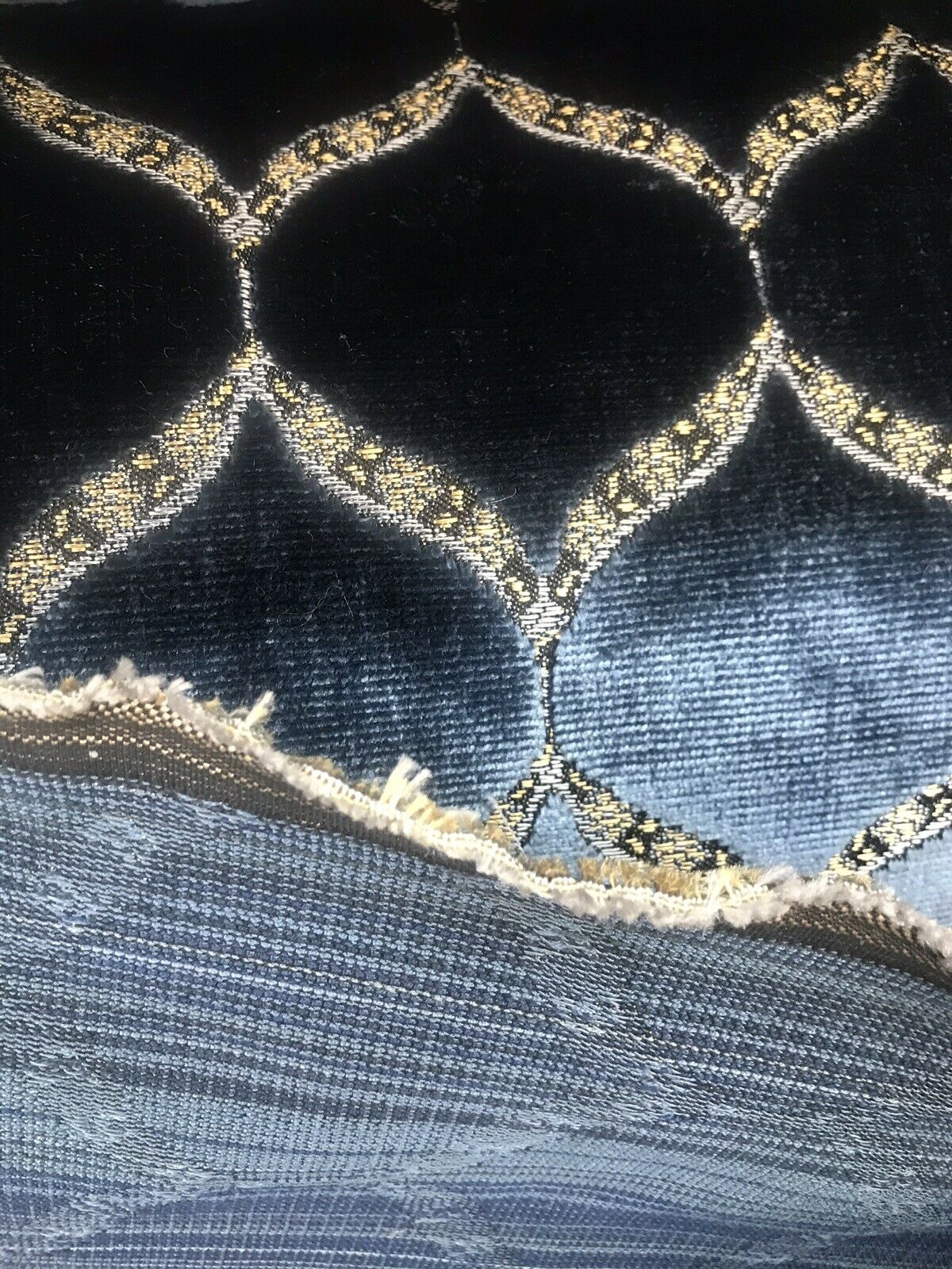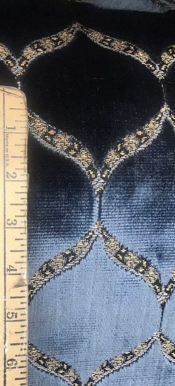 A brand new INCREDIBLE thick burnout upholstery velvet from Italy! The quality of this fabric is exquisite, photos do not do it justice! A beautiful heavy upholstery weight designer burnout velvet woven fabric in the most incredible shade of jewel blue with gold geometric motif. The burnout velvet has a very rich thick pile. The last photo features a matching fabric that we also have available. We have limited quantities of this fabric (about 55 yards left in total). Can be used for upholstery, interior decorating, or coat garments. This fabric is sold by the continuous yard.