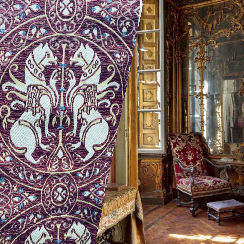 NEW Queen Marion Novelty Ritz Neoclassical Brocade Medallion Striped Jacquard Satin Fabric - Made in Italy - Gold Red Beige