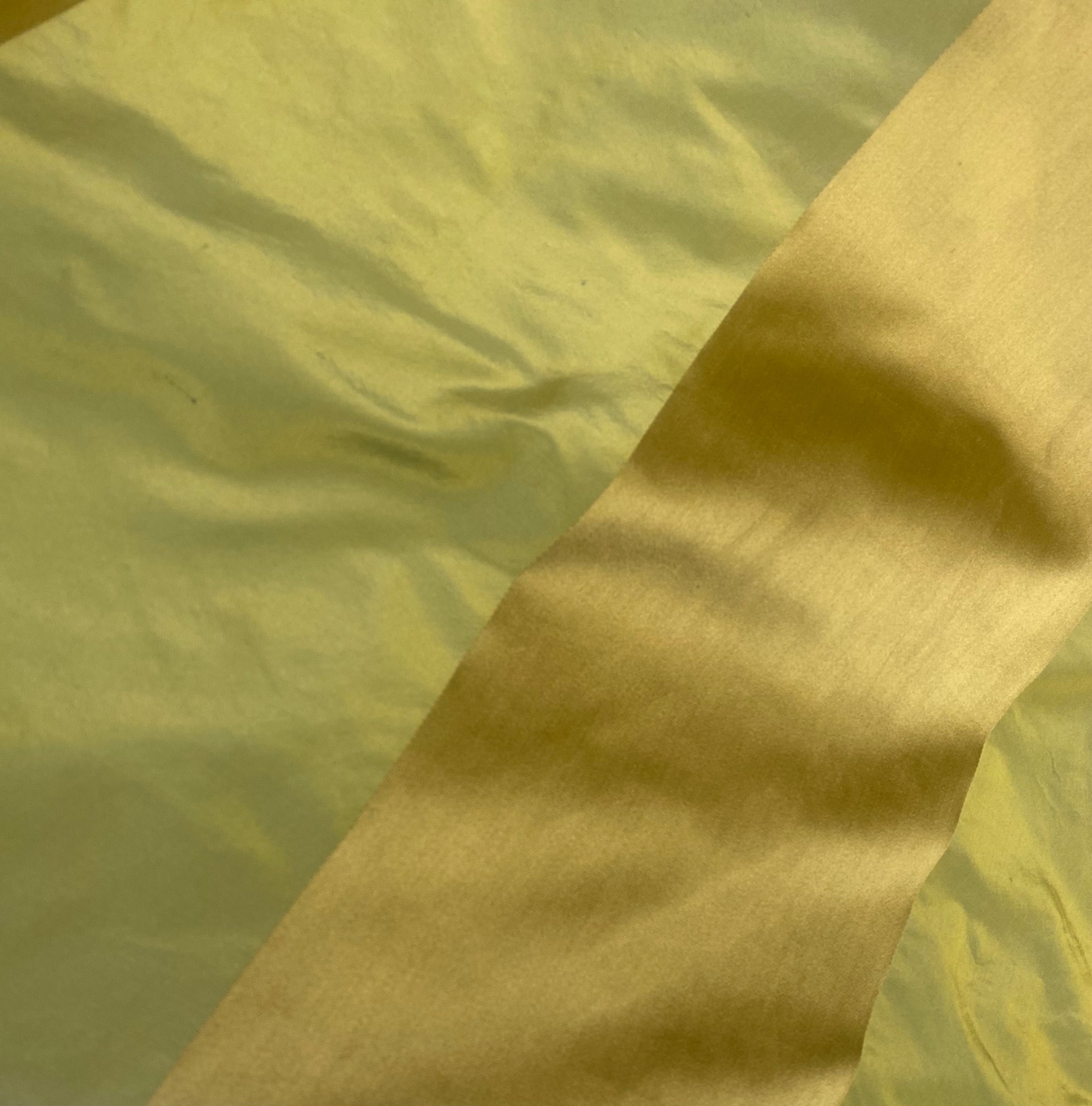 A beautiful Designer 100% Silk in the most gorgeous shade of leaf green and gold stripes. Can be used for interior decorating, costume dress and skirts garments. Sold by the yard. 55” wide.