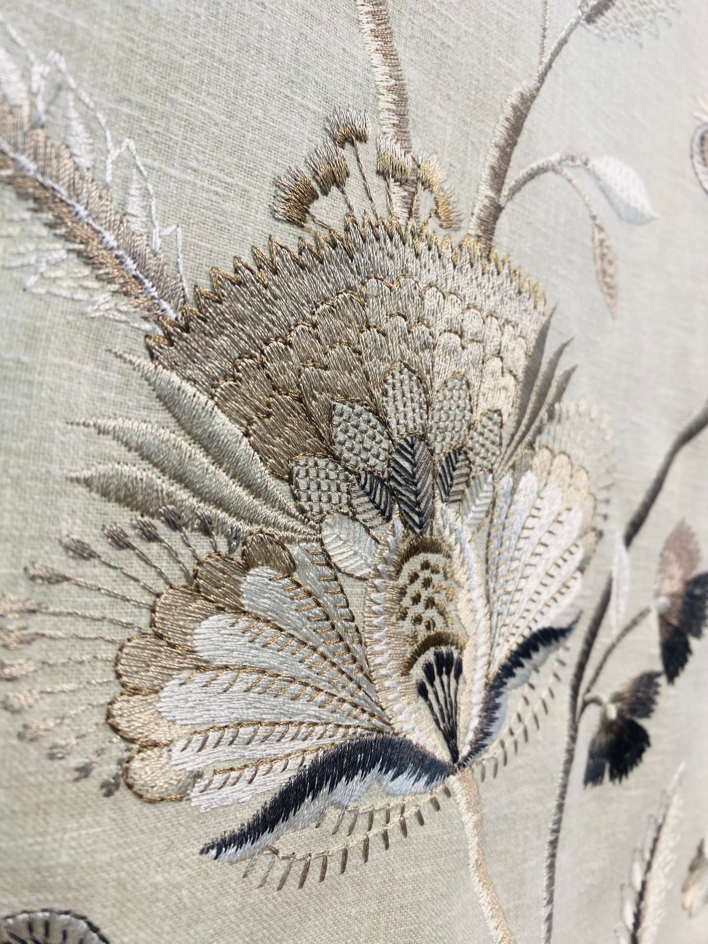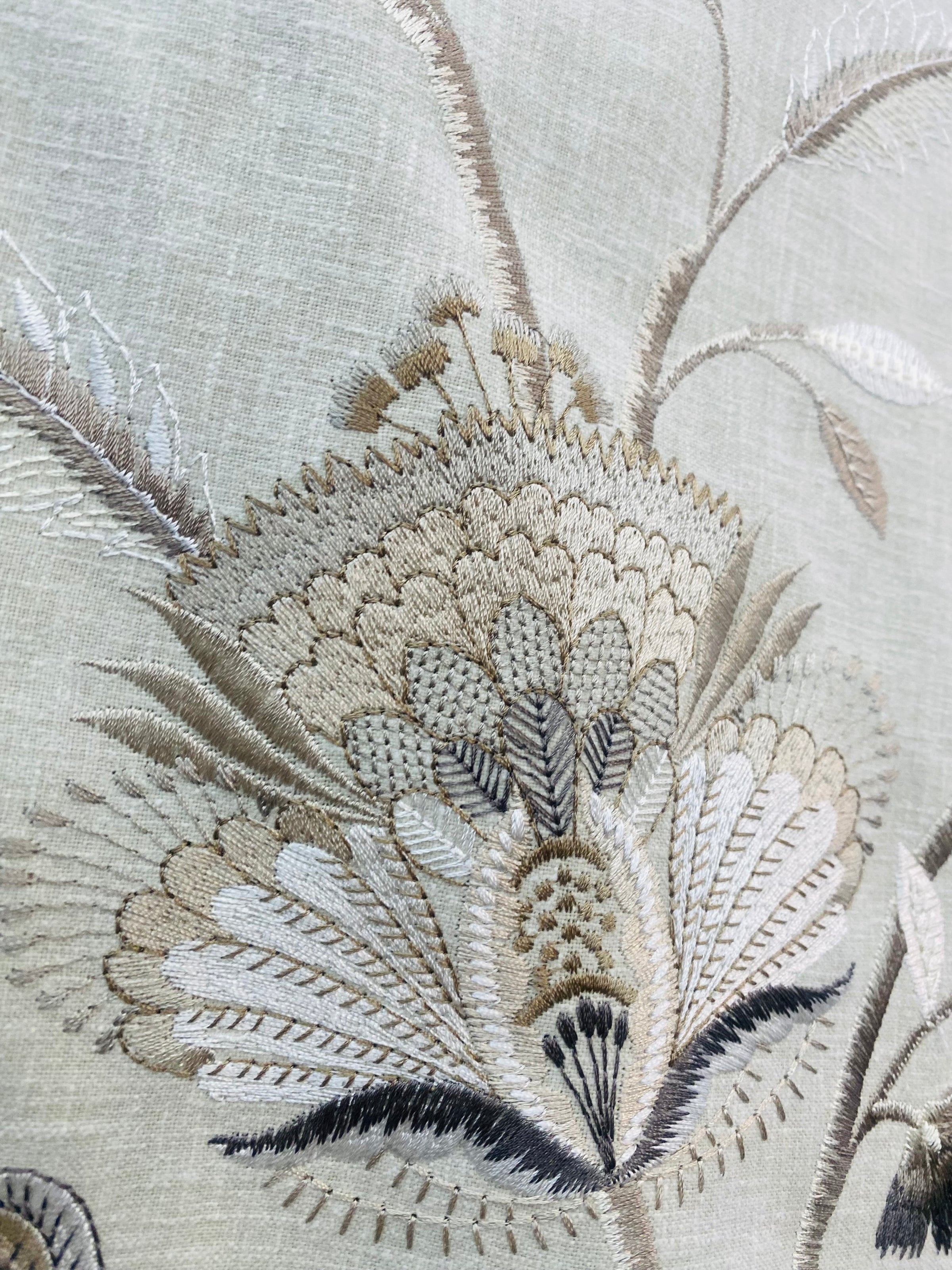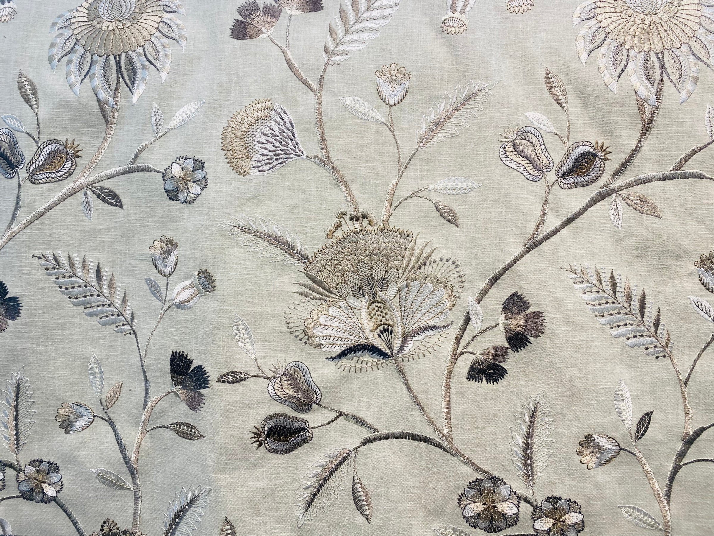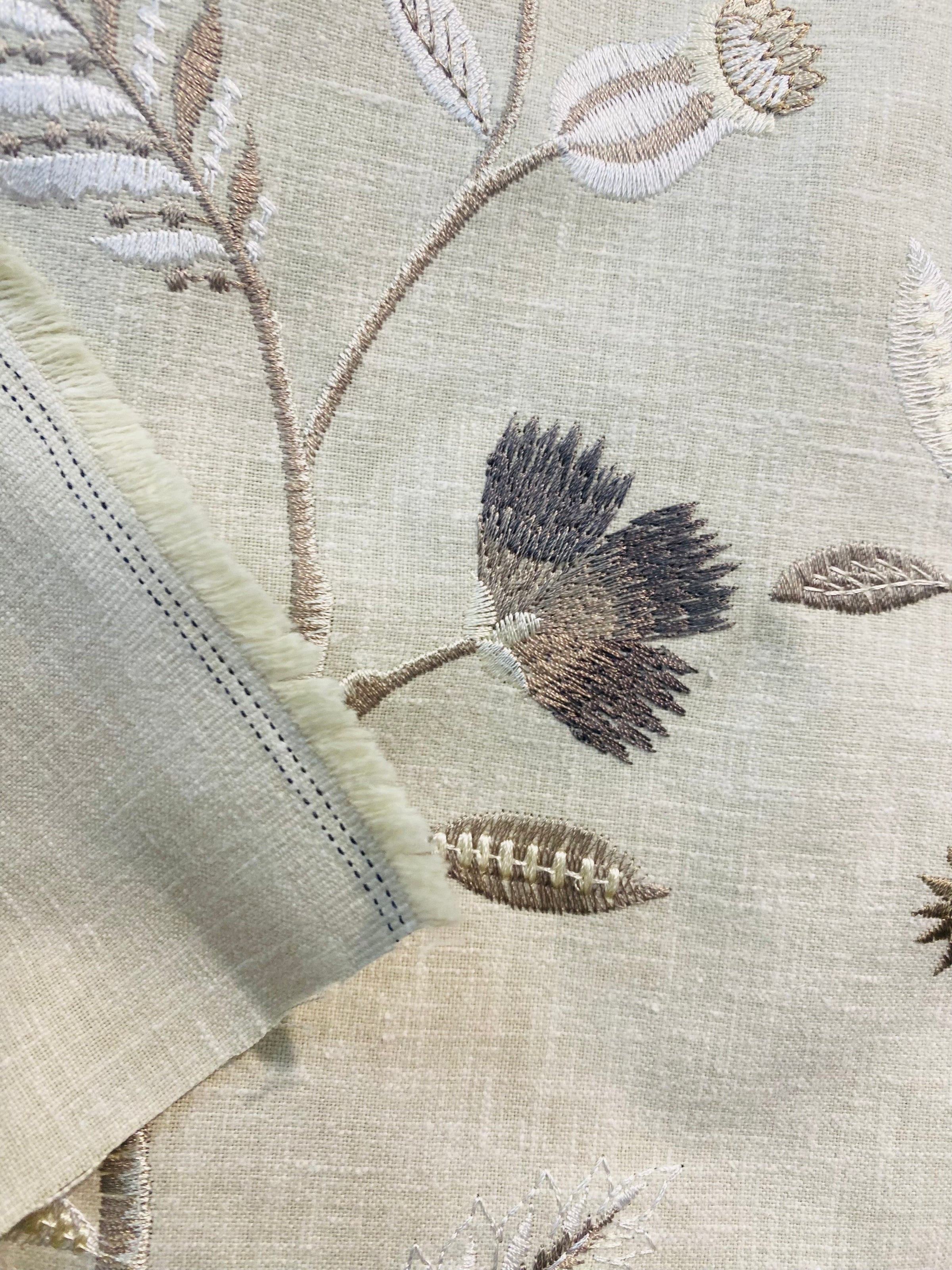 A beautiful Designer Novelty fabric with a gorgeous oversized floral embroidery, a linen inspired texture. Exquisite! The background is a cream and the embroidery are neutral tones. Can be used for interior decorating or fashion. Sold by the yard. 55” wide. 100% Cotton.