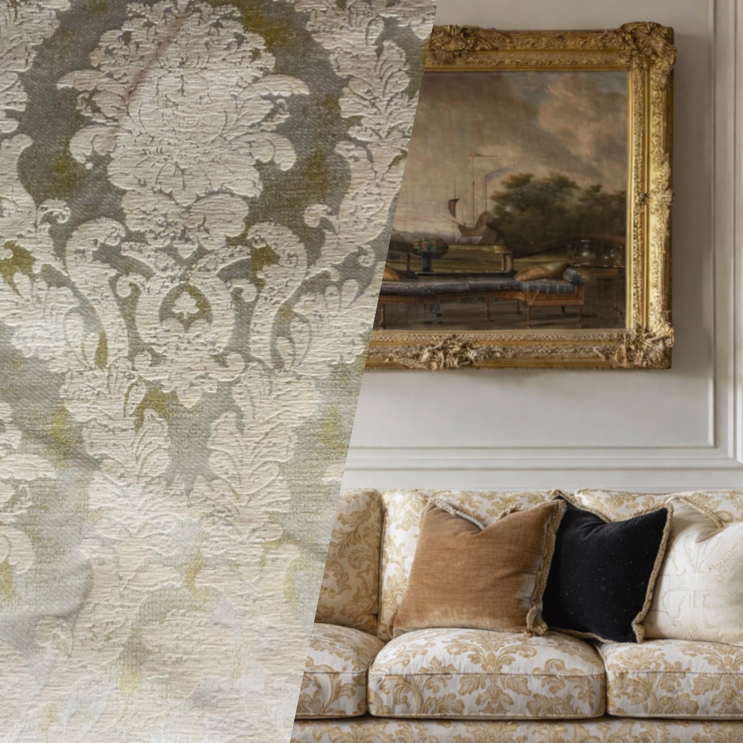 NEW Lord Augustin Designer Double Sided Velvet Chenille Burnout Damask Upholstery Fabric - Cream & Gold