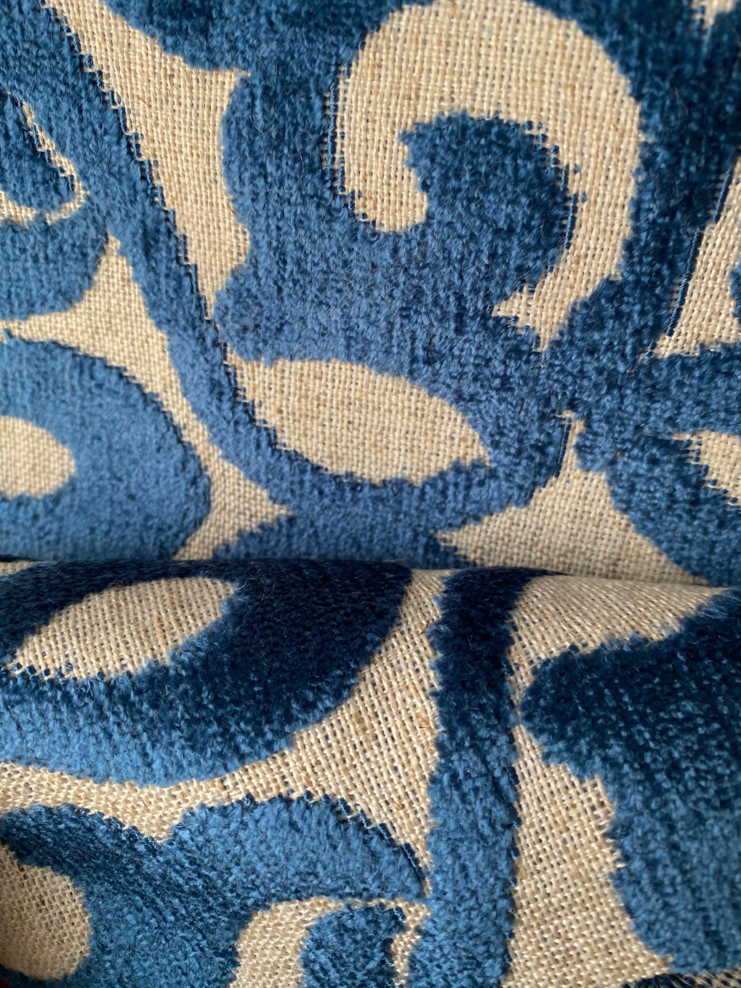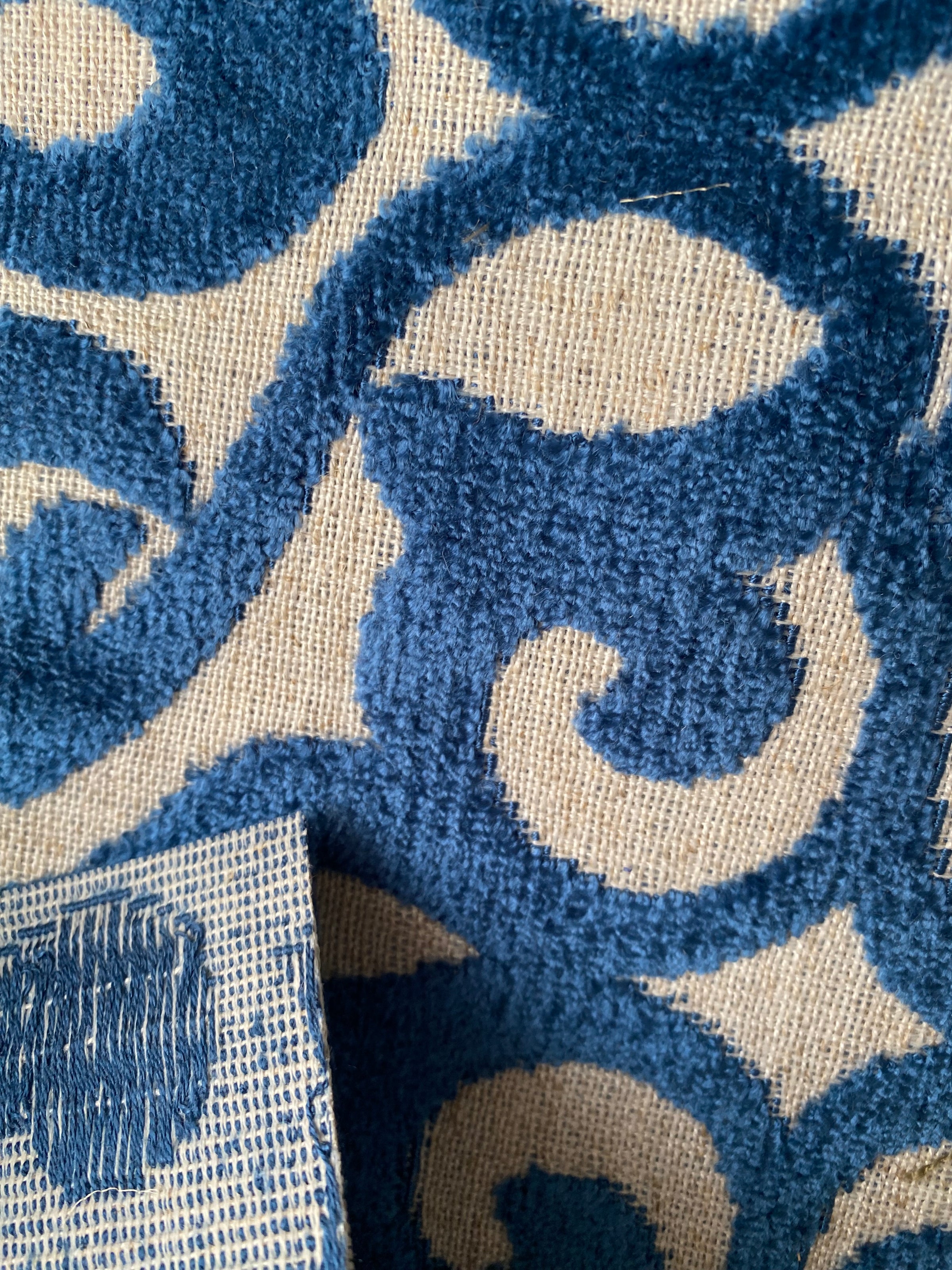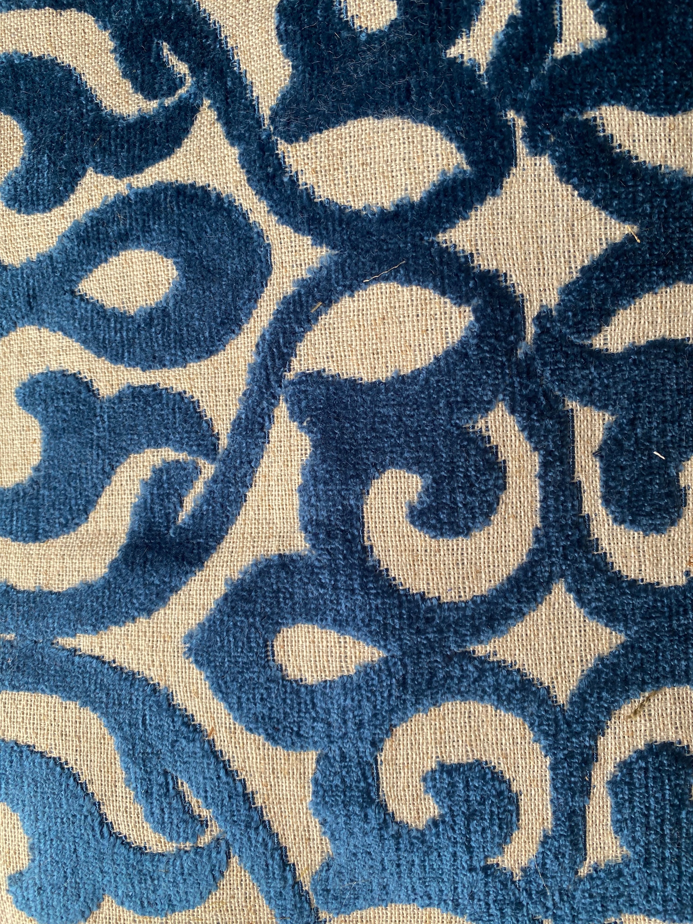 Another thick beautiful burnout novelty velvet! A beautiful durable upholstery weight designer burnout velvet woven fabric. Inspired by Versailles, the blue creates a damask motif across the fabric. The burnout velvet has a very rich thick pile, almost chenille type texture. Can be used for upholstery, interior decorating, or coat garments. Sold by the yard. 56” wide.