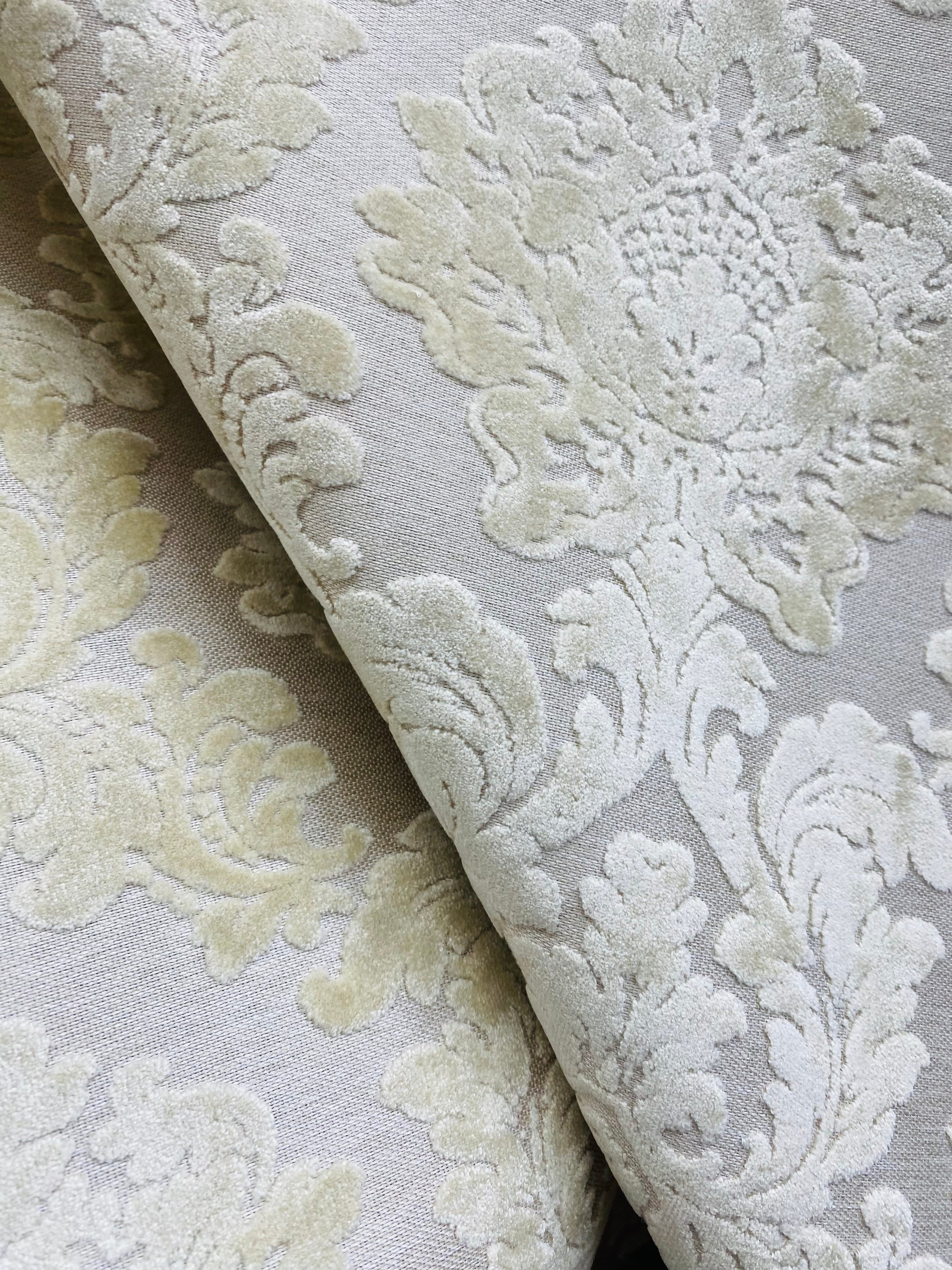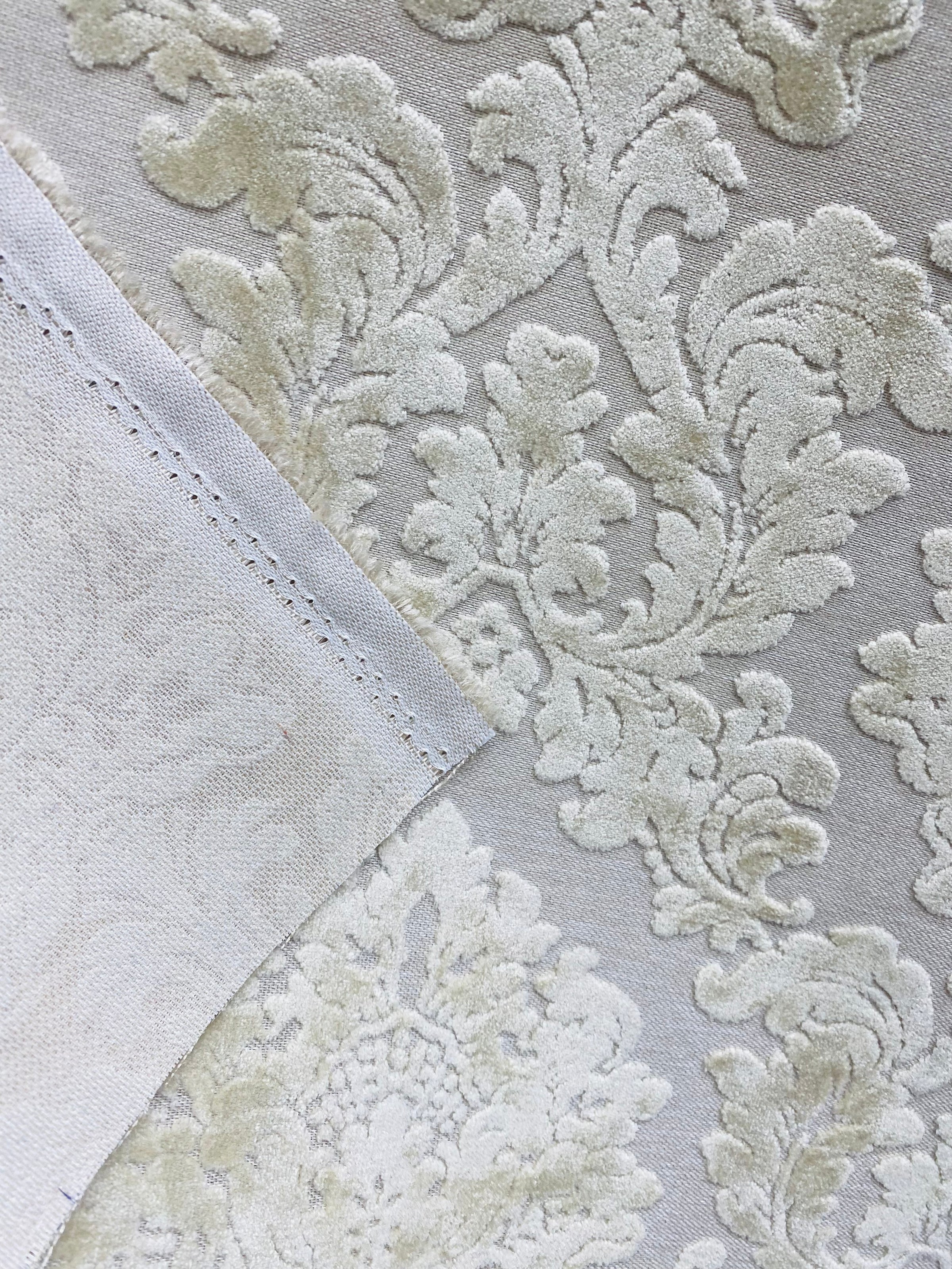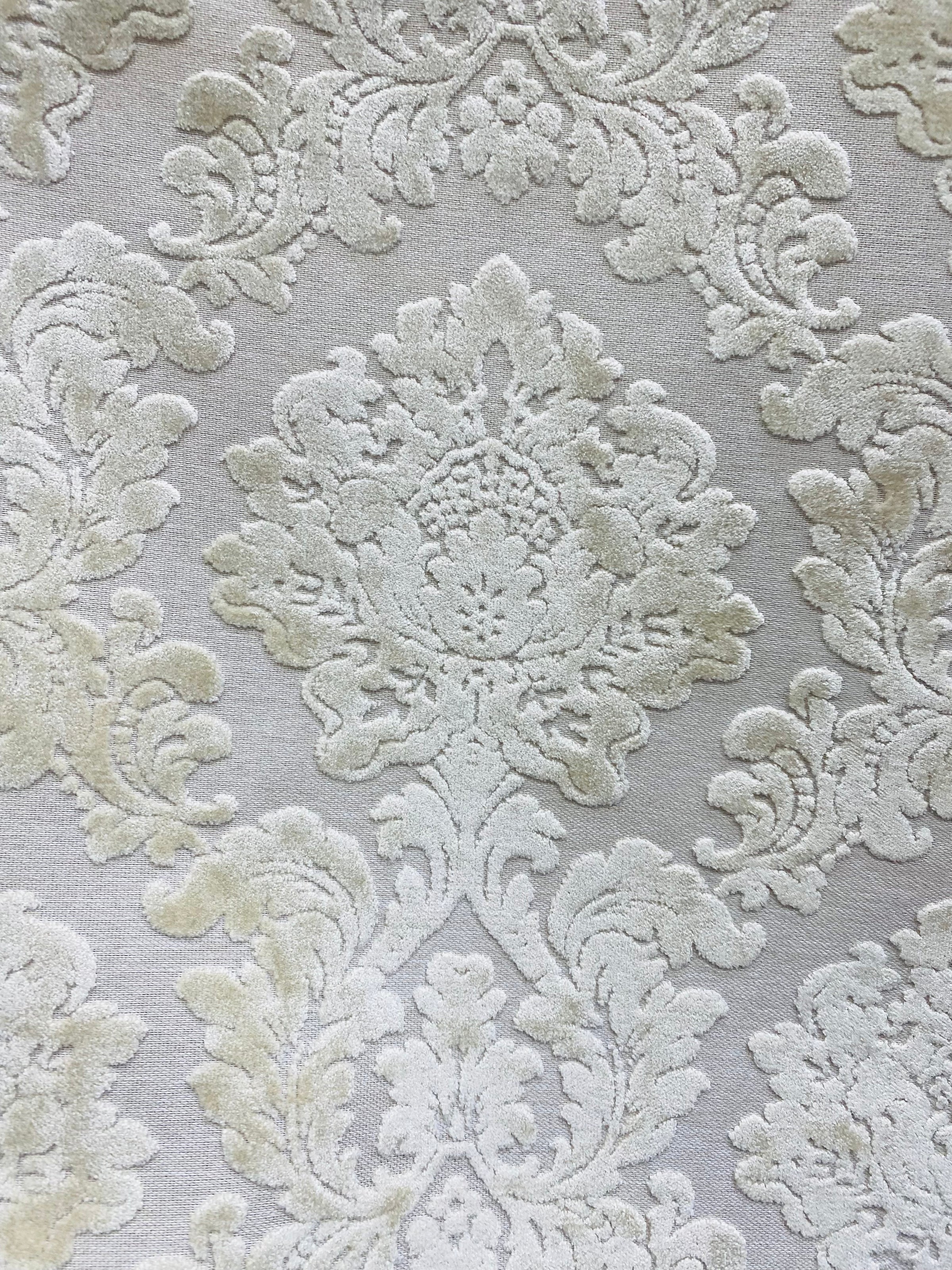 A beautiful interior design chenille burnout velvet fabric in a beautiful damask motif. The color is exquisite! A beautiful shade of Pearl. Very soft hand. Can be used for interior decorating, upholstery, pillows, or coat garments. Sold by the yard. 56” wide.