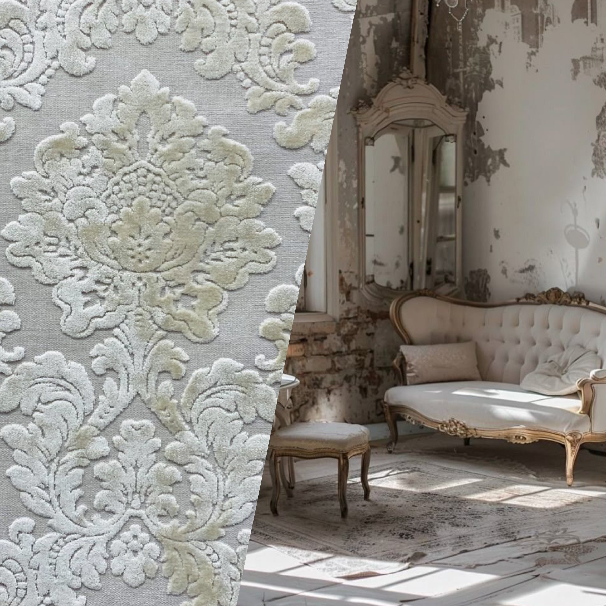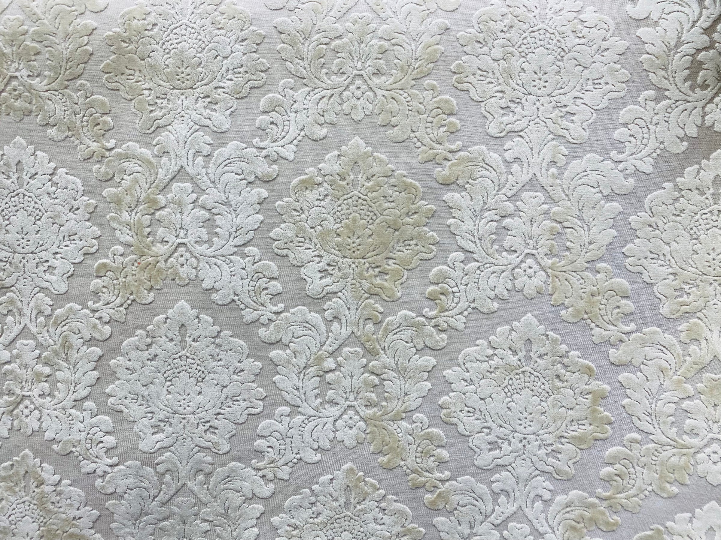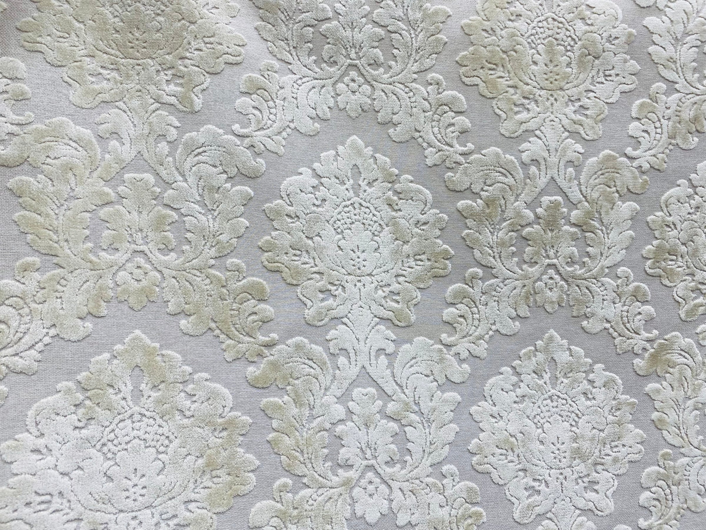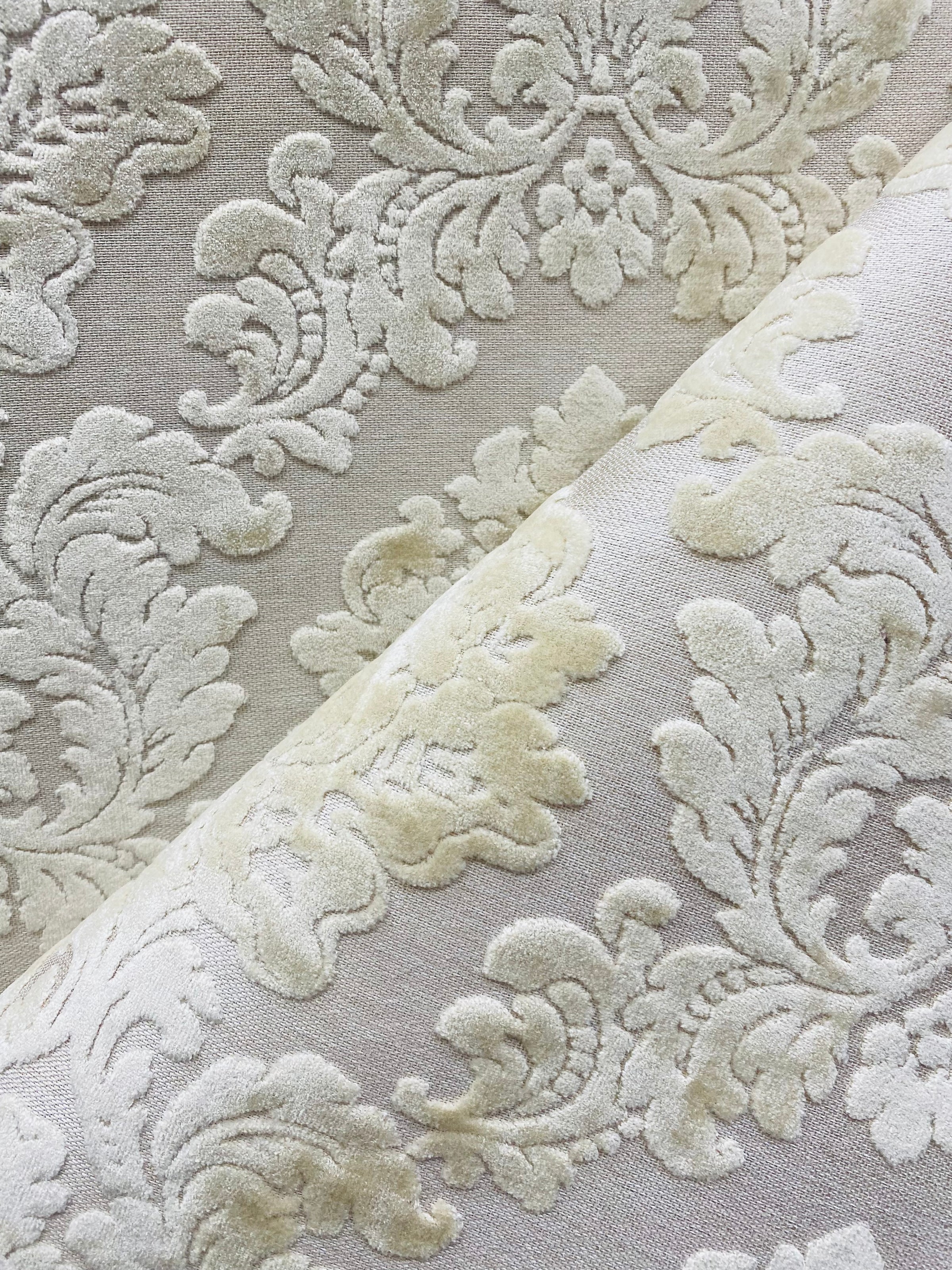 A beautiful interior design chenille burnout velvet fabric in a beautiful damask motif. The color is exquisite! A beautiful shade of Pearl. Very soft hand. Can be used for interior decorating, upholstery, pillows, or coat garments. Sold by the yard. 56” wide.