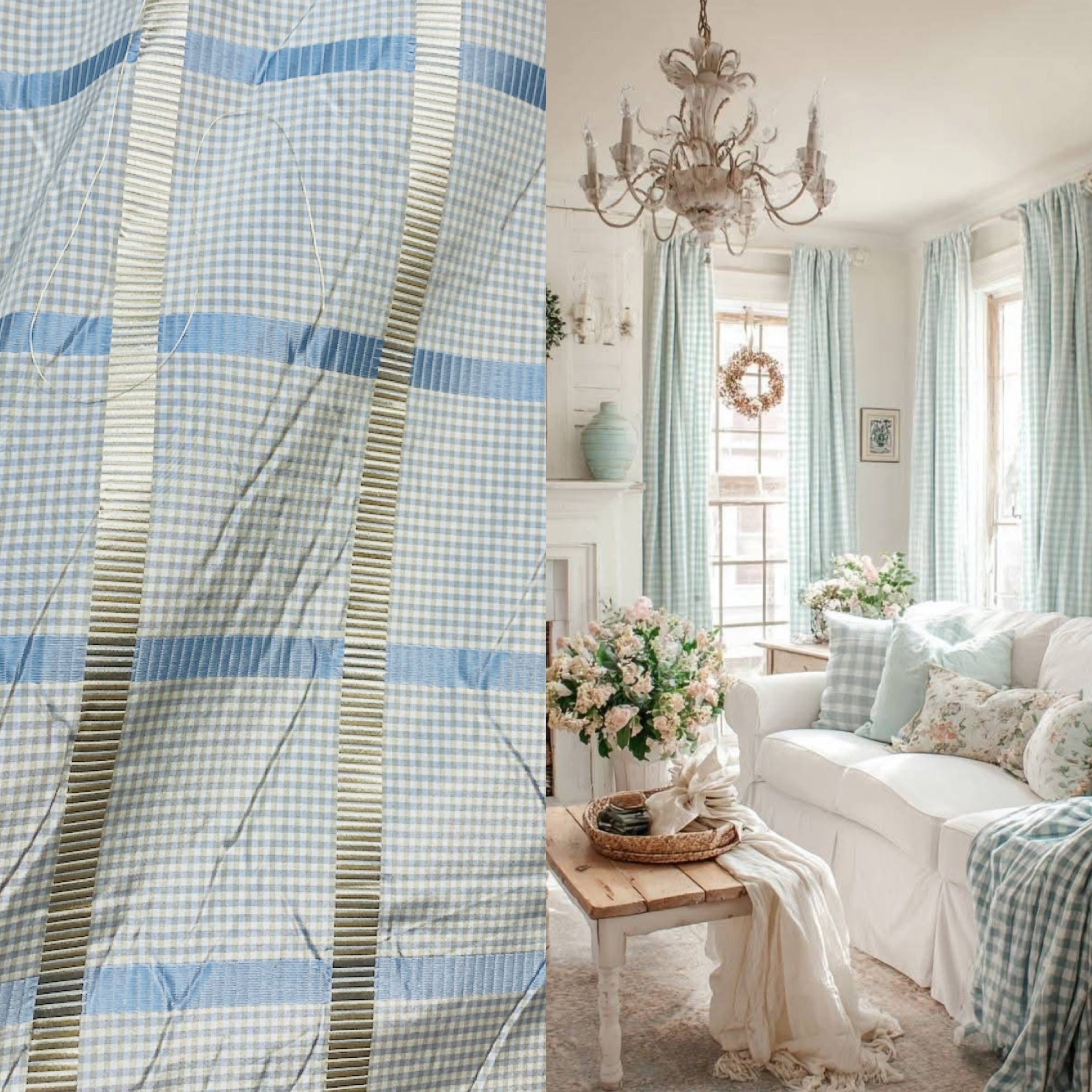 A beautiful Designer 100% Silk Taffeta in the most beautiful shade of blue and gold. Small intricate textured ribbon stripes cascade down the face of the fabric over a Gingham pattern. Absolutely exquisite! Can be used for drapery, interior decorating, pillows, duvet or dress and skirts garments. Sold by the yard. 55” wide.