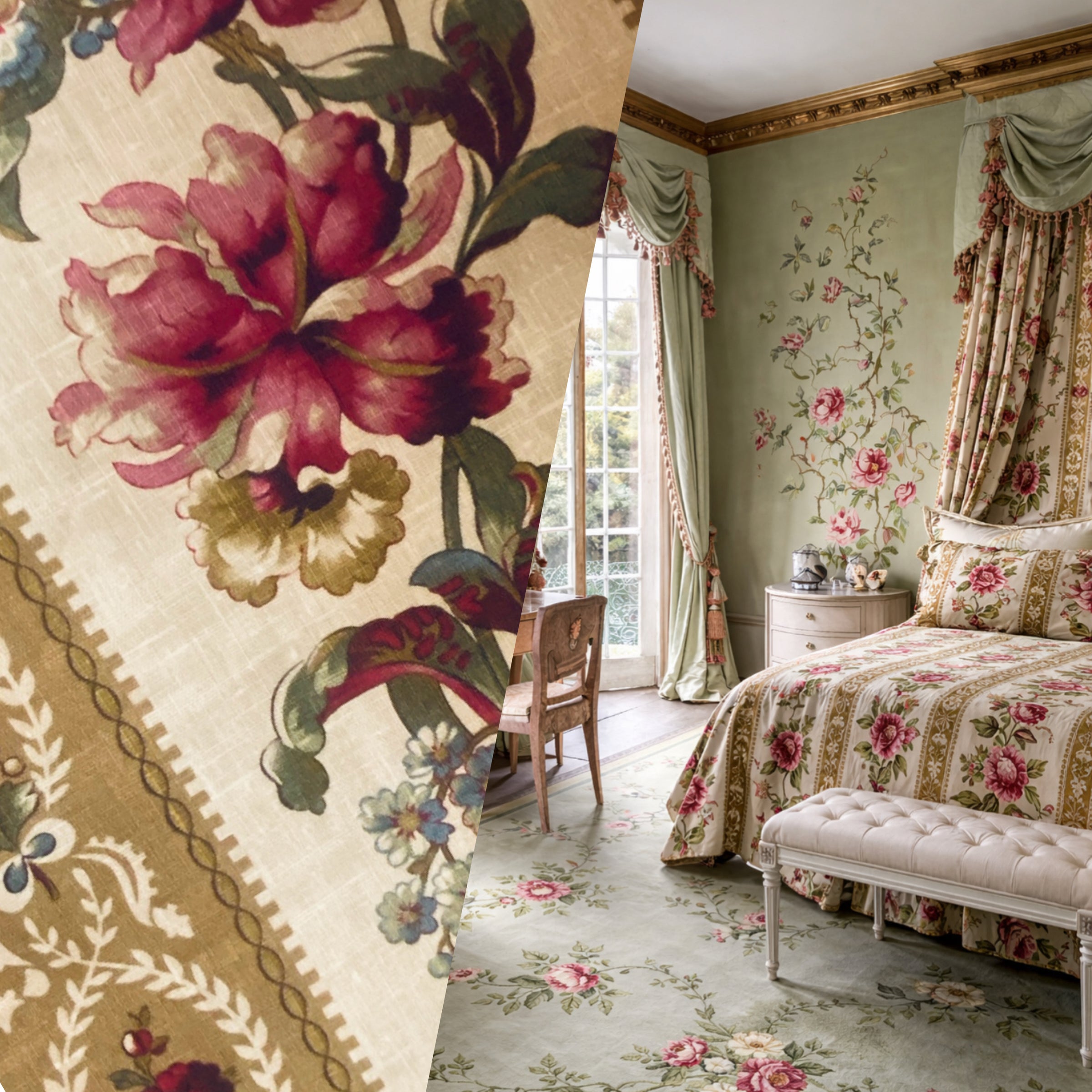 NEW! Princess Peppa Novelty 100% Linen Fabric Floral - Burgundy, Gold and Natural