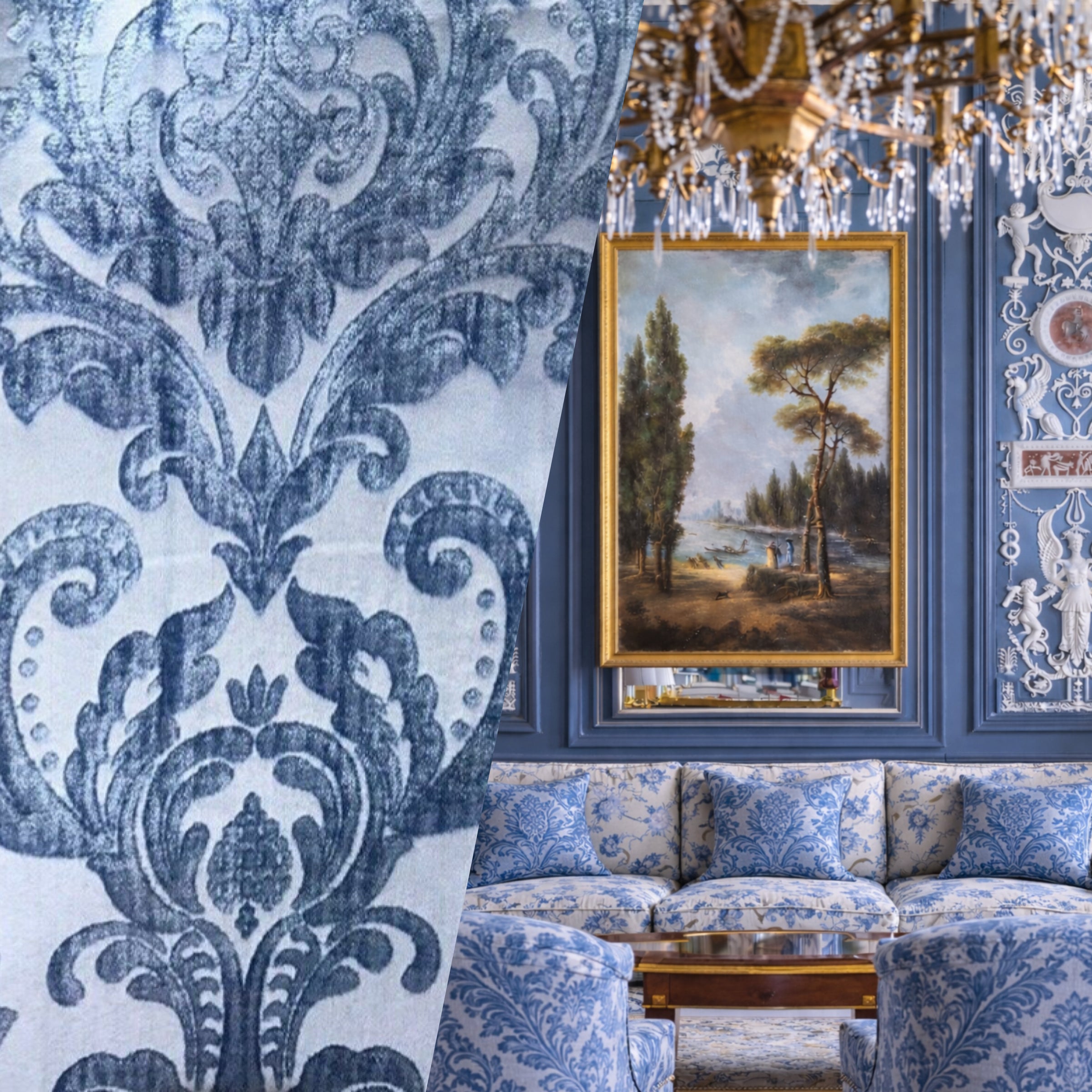A beautiful interior design chenille burnout velvet fabric in a beautiful damask motif. The color is exquisite! A beautiful deep shade of jewel blue. Very soft hand. Can be used for interior decorating, upholstery, pillows, or coat garments. Sold by the yard.
