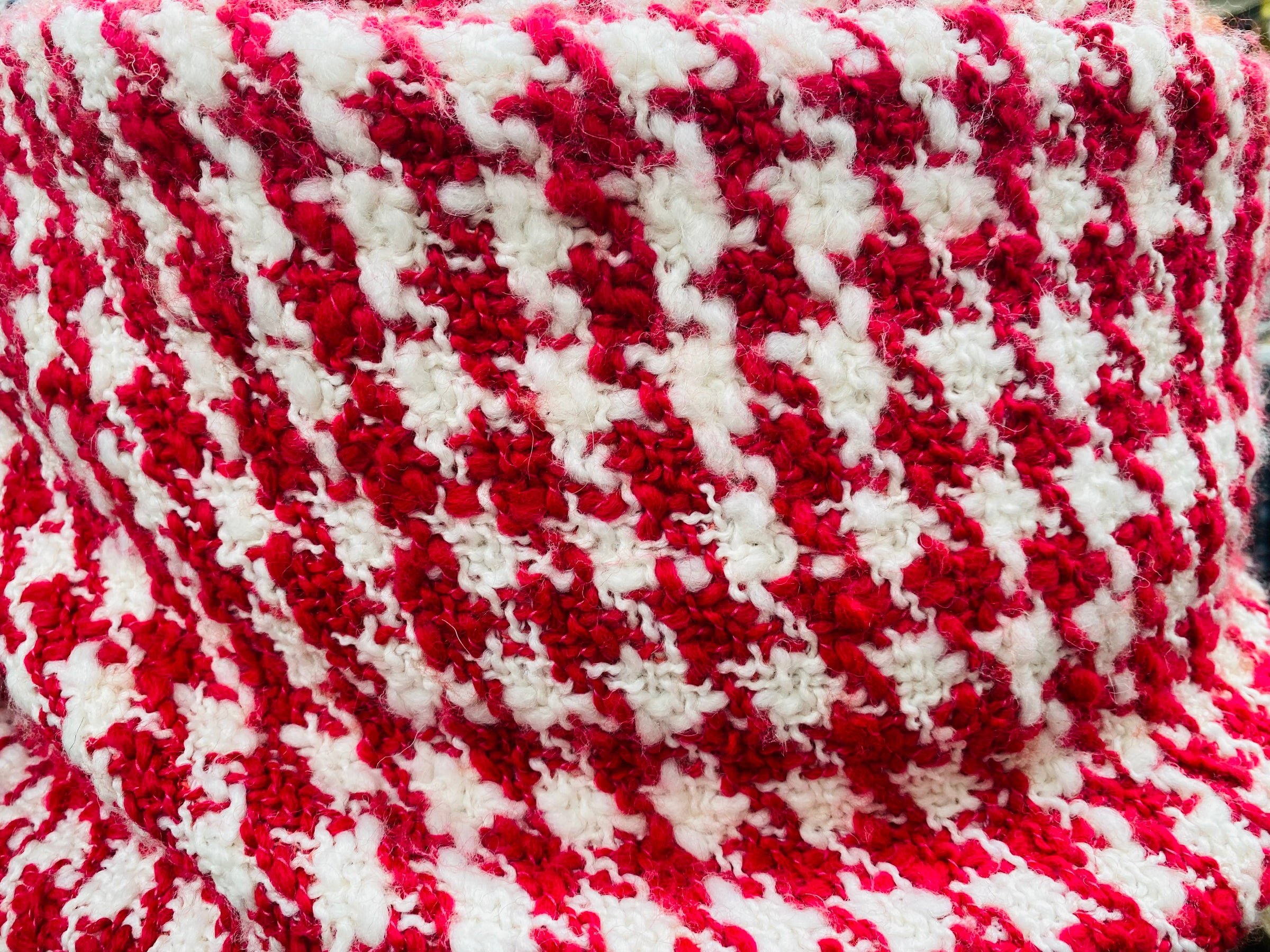 This durable heavy knit fabric has a beautiful houndstooth weave in a gorgeous shade of fuchsia red and white. Very unique and hard to come by. Sold by the yard. 55” wide. Made in Italy.