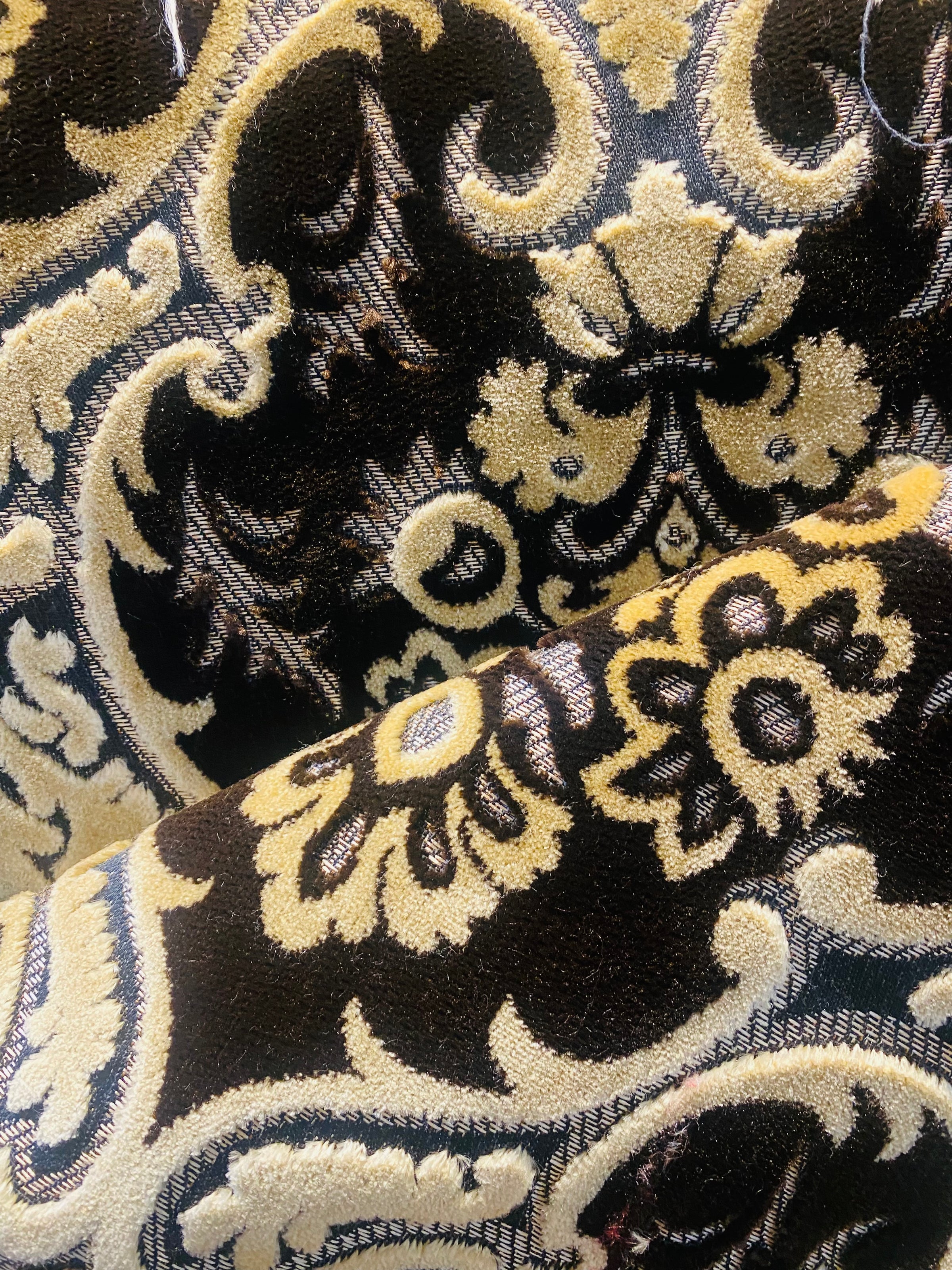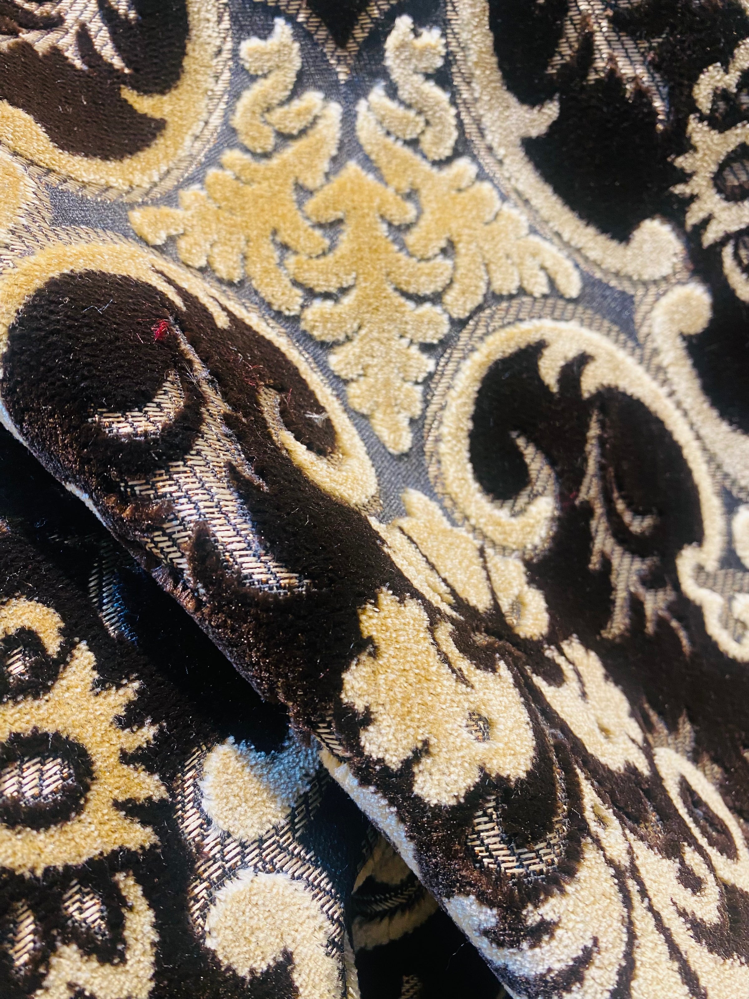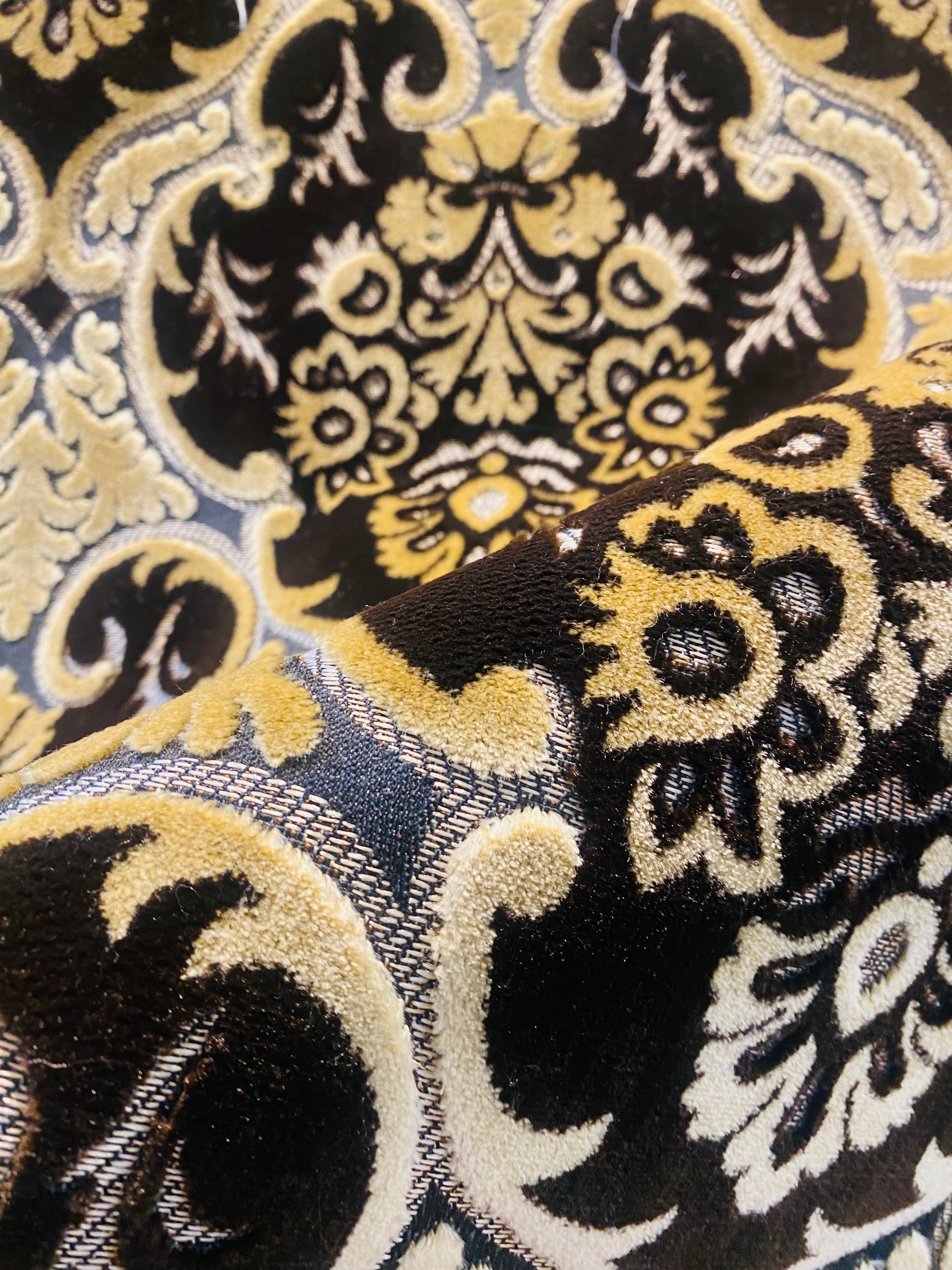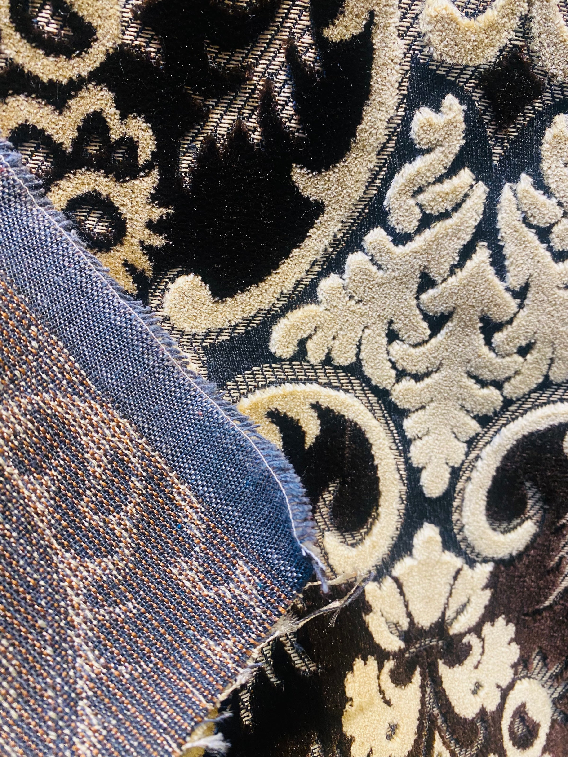 Another thick beautiful burnout velvet with Italian flair! A beautiful durable upholstery weight designer burnout velvet woven fabric. Inspired by old world Italian style, the deep rich hues of Brown and Beige create a medallion motif across the fabric. The burnout velvet has a very rich thick pile type texture. Exquisite! Can be used for upholstery, interior decorating, or coat garments. Sold by the yard. 56” wide.